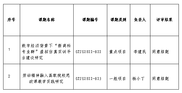 根据《四川省教育厅关于开展2022—2024年职业教育人才培养和教育教学改革研究项目结题验收的通知》和《四川文轩职业学院科研课题结题验收办法和标准》的相关要求,科研处根据课题研究学科类别,组织校内外专家,分别对我校立项的重点课题《数字经济背景下“新商科专业群”虚拟仿真实训平台建设研究》和一般课题《劳动精神融入高职院校思政课教学实践研究》的结题材料进行评审,2项教改课题经专家鉴定达到了结题要求,同意结题,现将验收结果予以公示(见附件),公示期为3个工作日,公示期间若有异议,请以书面材料的形式向科研处反映,逾期不再受理。