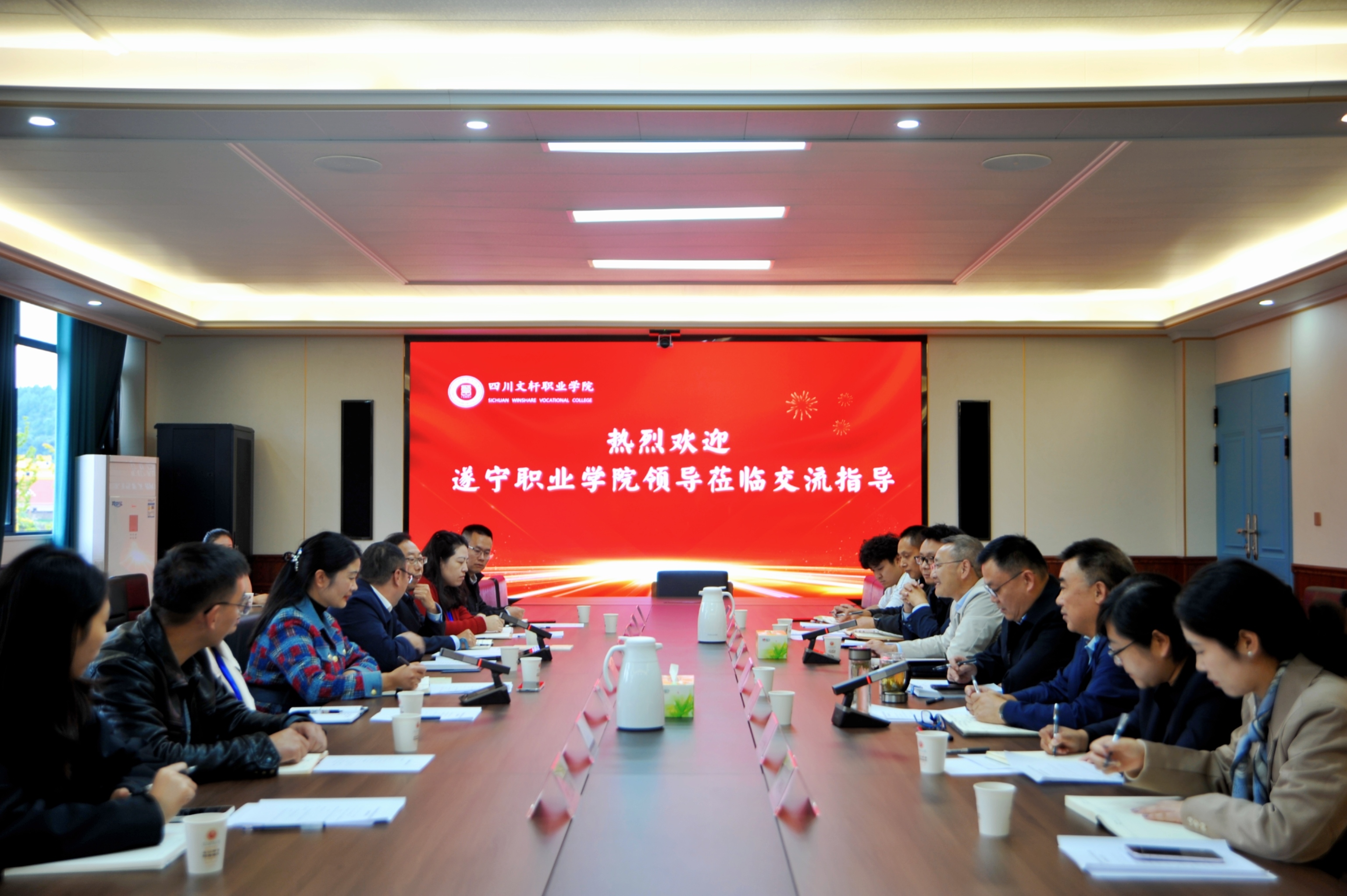 刘志东校长介绍了遂宁职业学院发展历程和创办以来取得的成绩,学校通过两年时间的努力,完成了校园一期规划建设和三届学生招生培养,教师队伍和管理干部队伍快速成长,为高质量育人提供了坚实保障。他表示遂宁职业学院与四川文轩职业学院同在一地办学,有很多方面可以互学互鉴,希望通过此次交流学习,增进双方友谊,加强交流互动,增强优势互补,助力学校发展,共同为地方高等职业教育发展贡献力量。